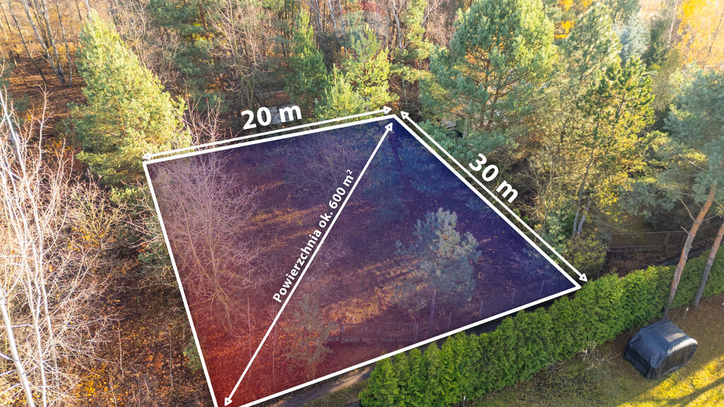 Wymiary działki to: regularny prostokąt około szer. 20m x dł. 30m.