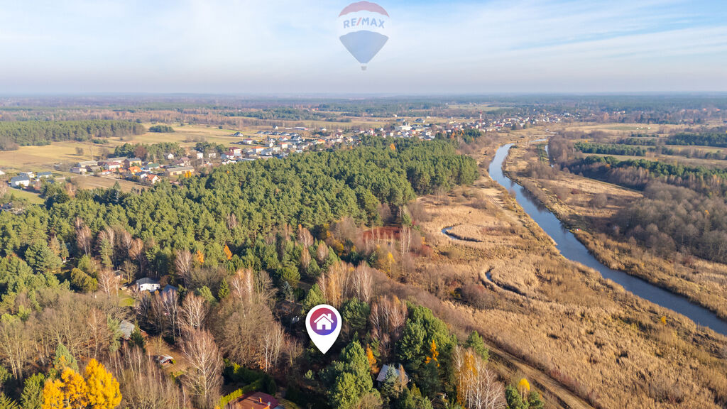 Dookoła domy jednorodzinne i letniskowe, rozlewisko rzeczki Rządzy